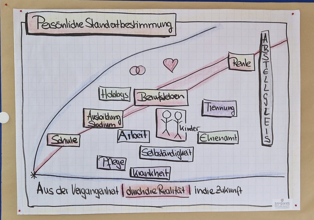 Der blaue Strich wird bewusst gesetzt: Wann soll die Zukunft anfangen? Bis wann können die gesetzten Ziele erreicht werden? Es ist wichtig, hier einen realistischen Zeitrahmen festzulegen.